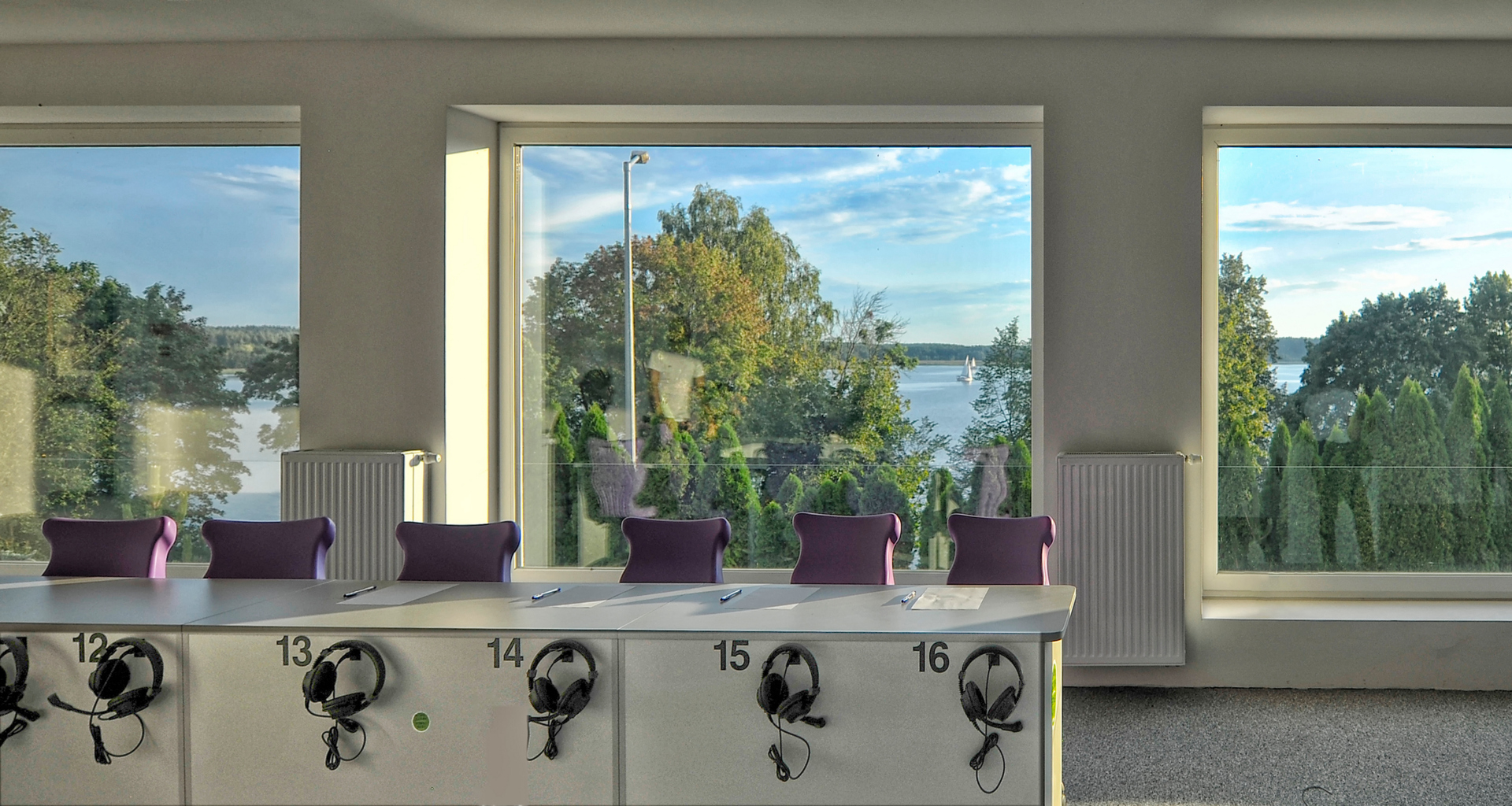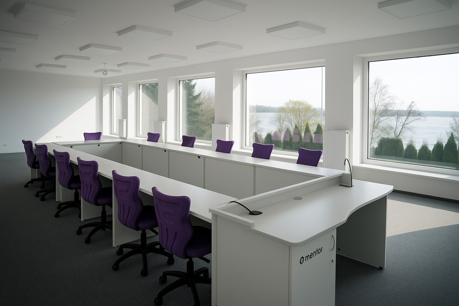 Nowoczesna sala konferencyjna z szarymi stolikami i fioletowymi krzesłami z widokiem na jezioro przez duże okna