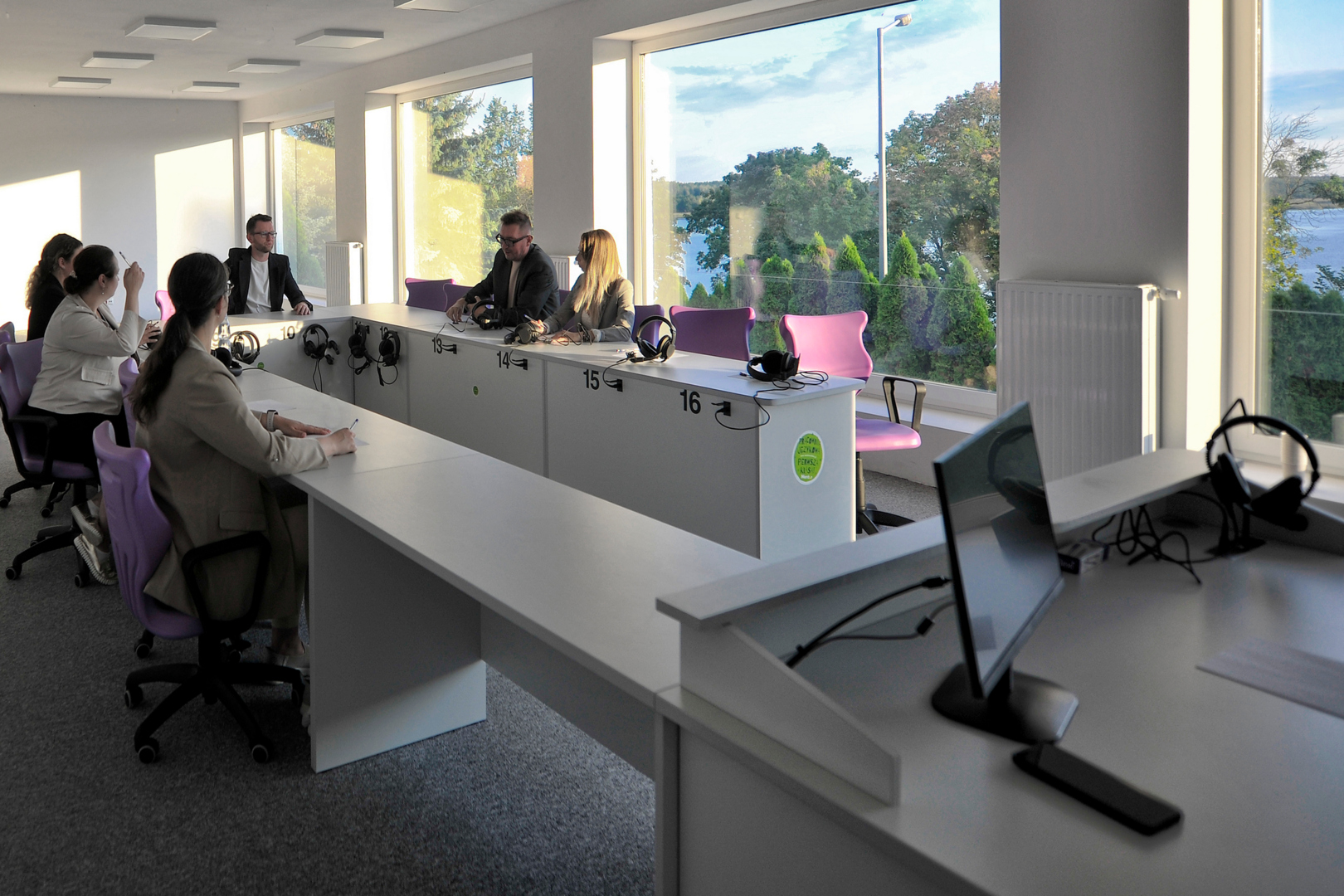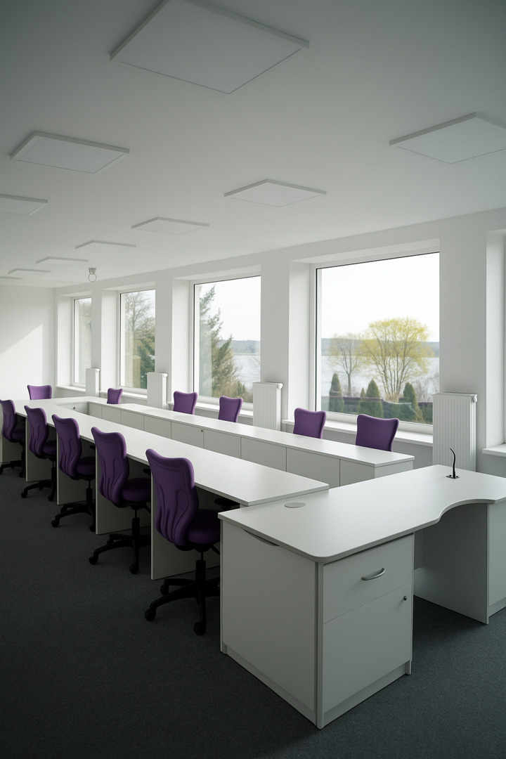Przestronne biuro z dużymi oknami, widokiem na drzewa i jezioro, fioletowymi krzesłami i jasnymi, nowoczesnymi meblami.