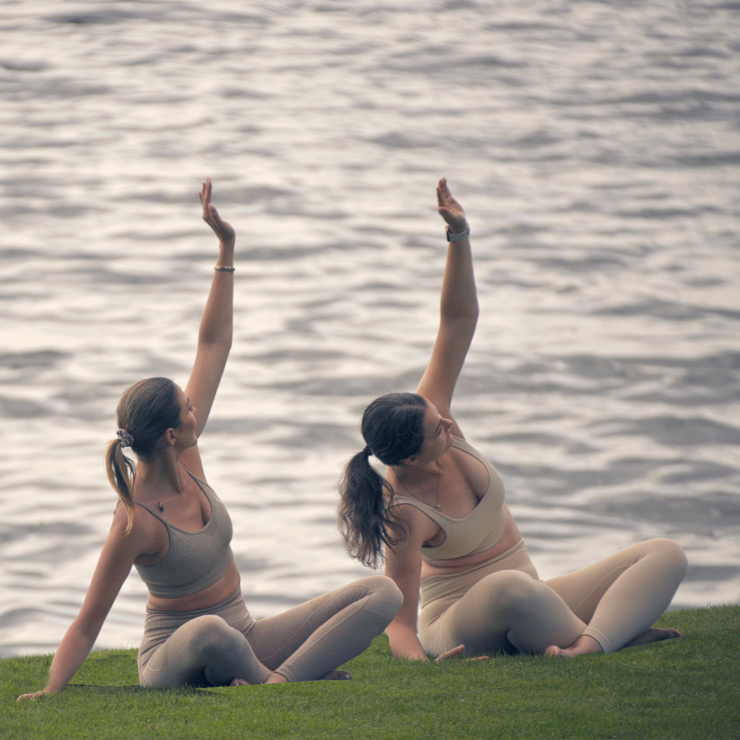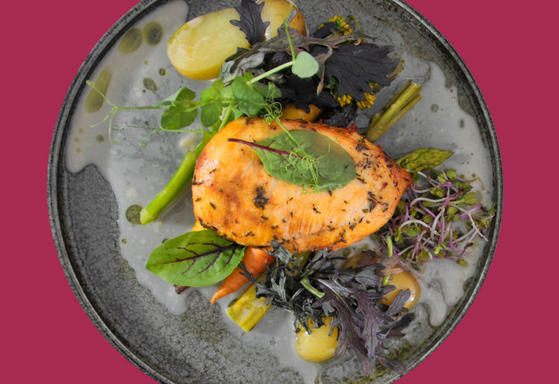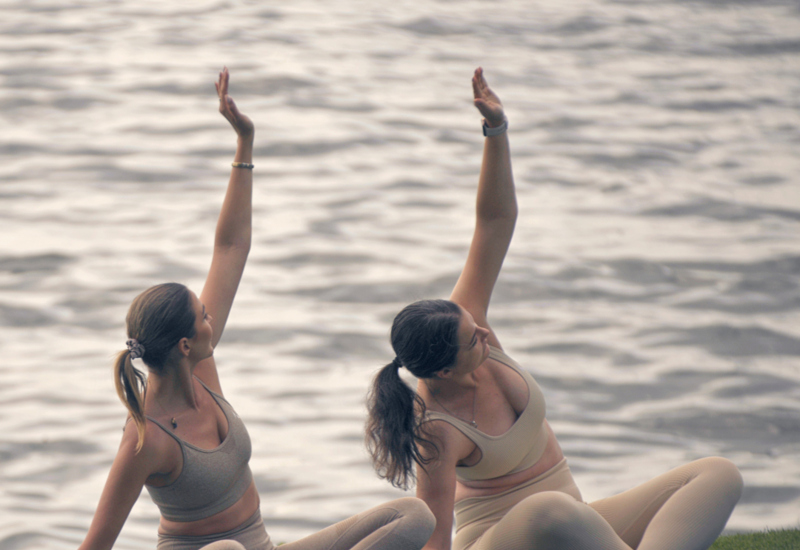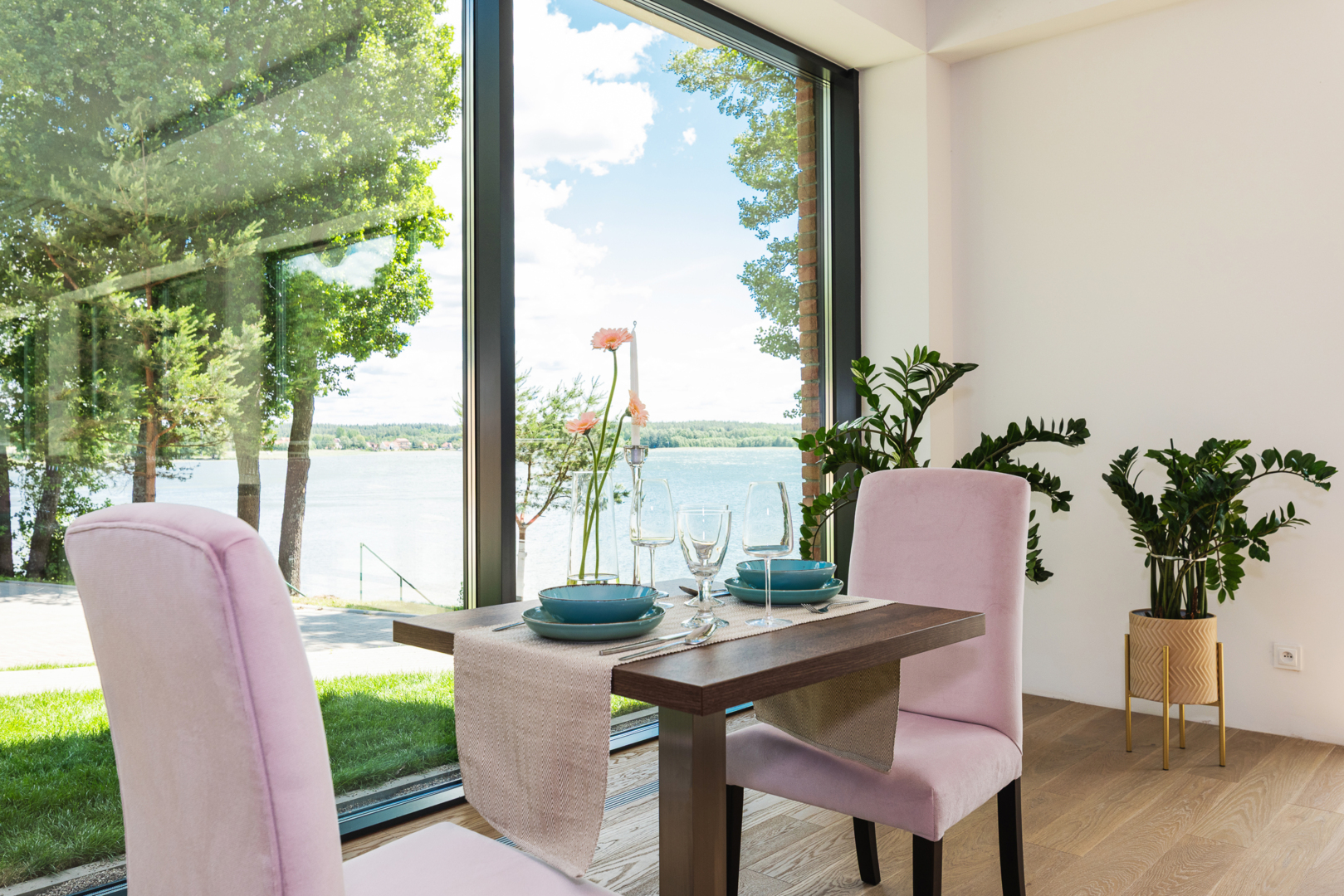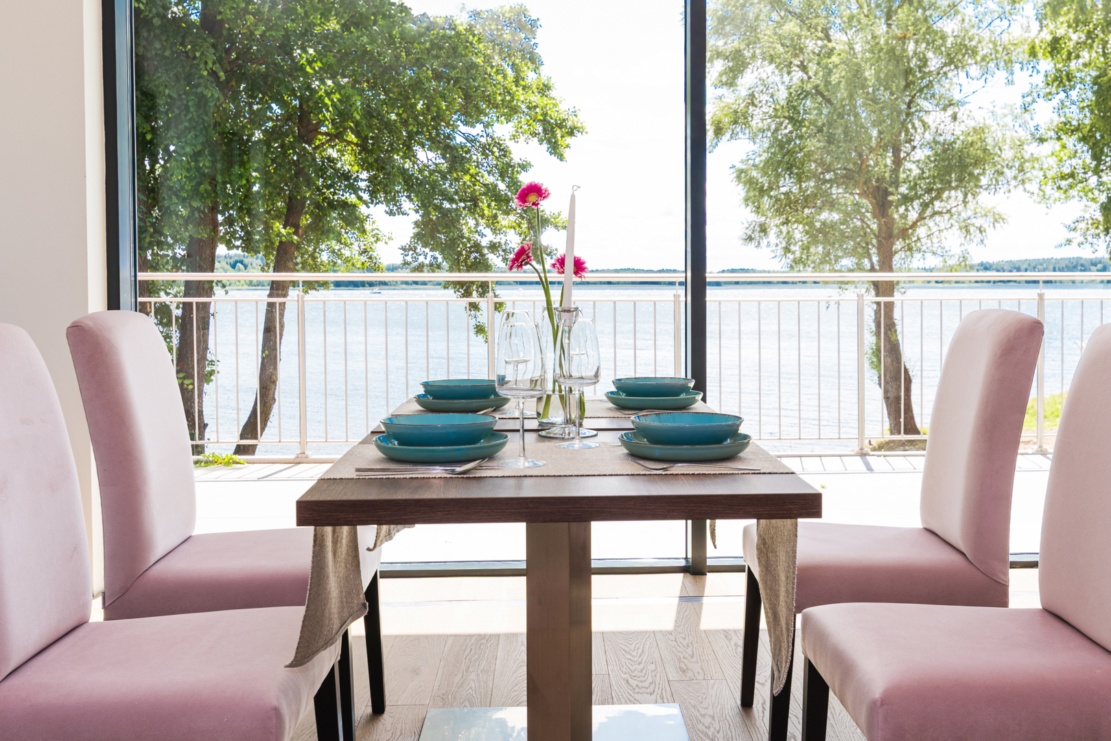 Restauracja z dużym oknem z widokiem na jezioro, stół dla dwóch osób z różowymi krzesłami i elegancką zastawą