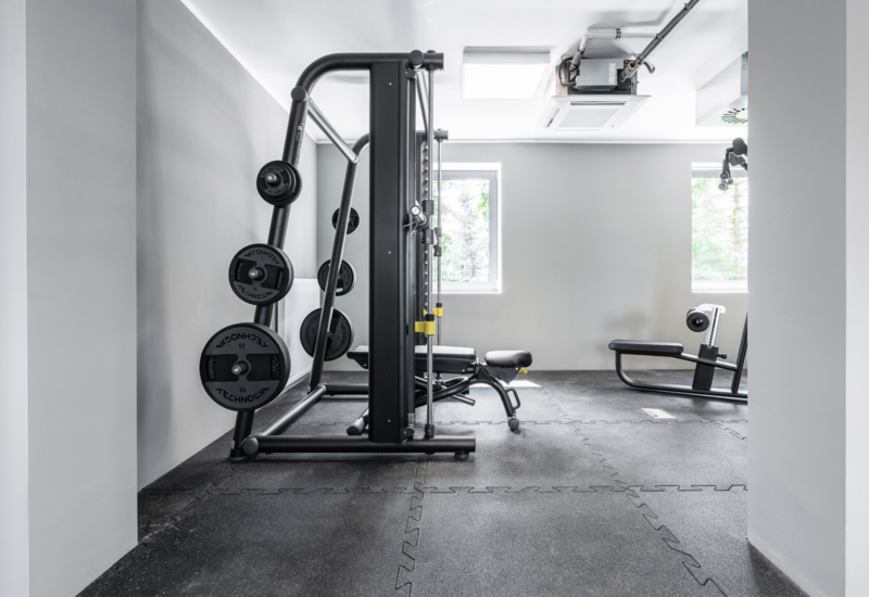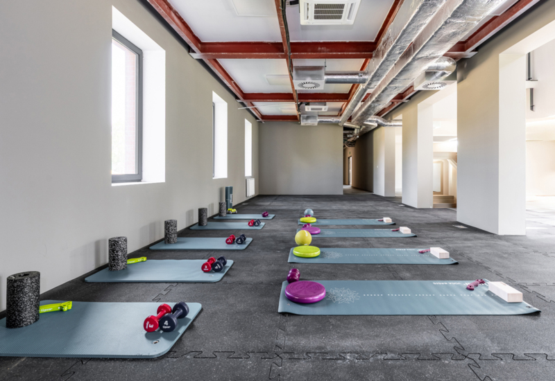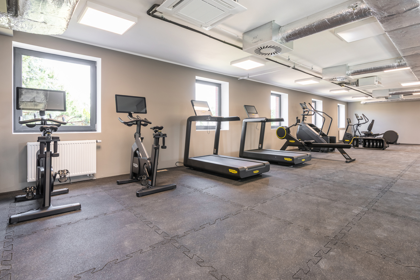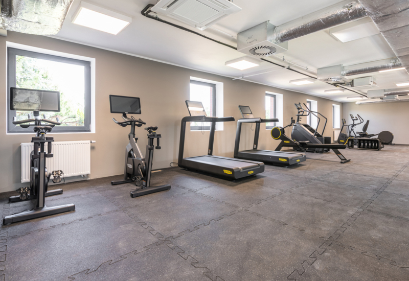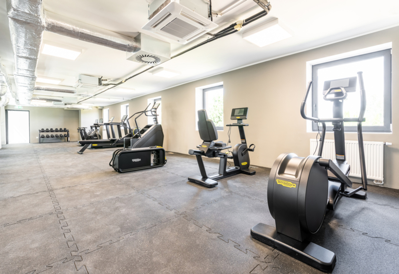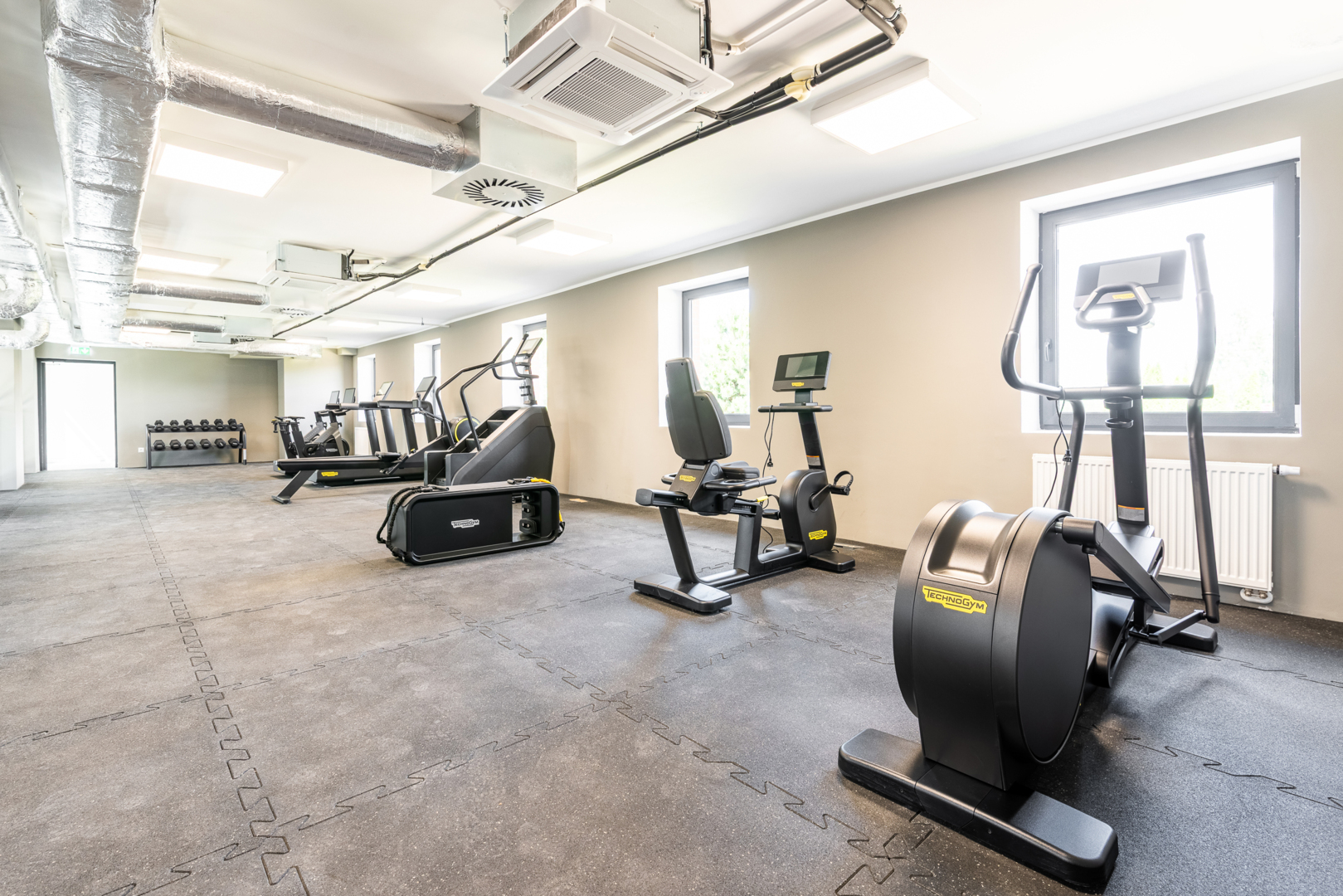 Nowoczesna siłownia hotelowa z różnorodnym sprzętem do ćwiczeń i naturalnym światłem przez okna.