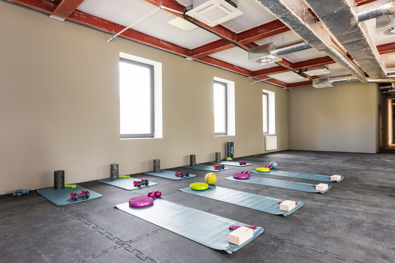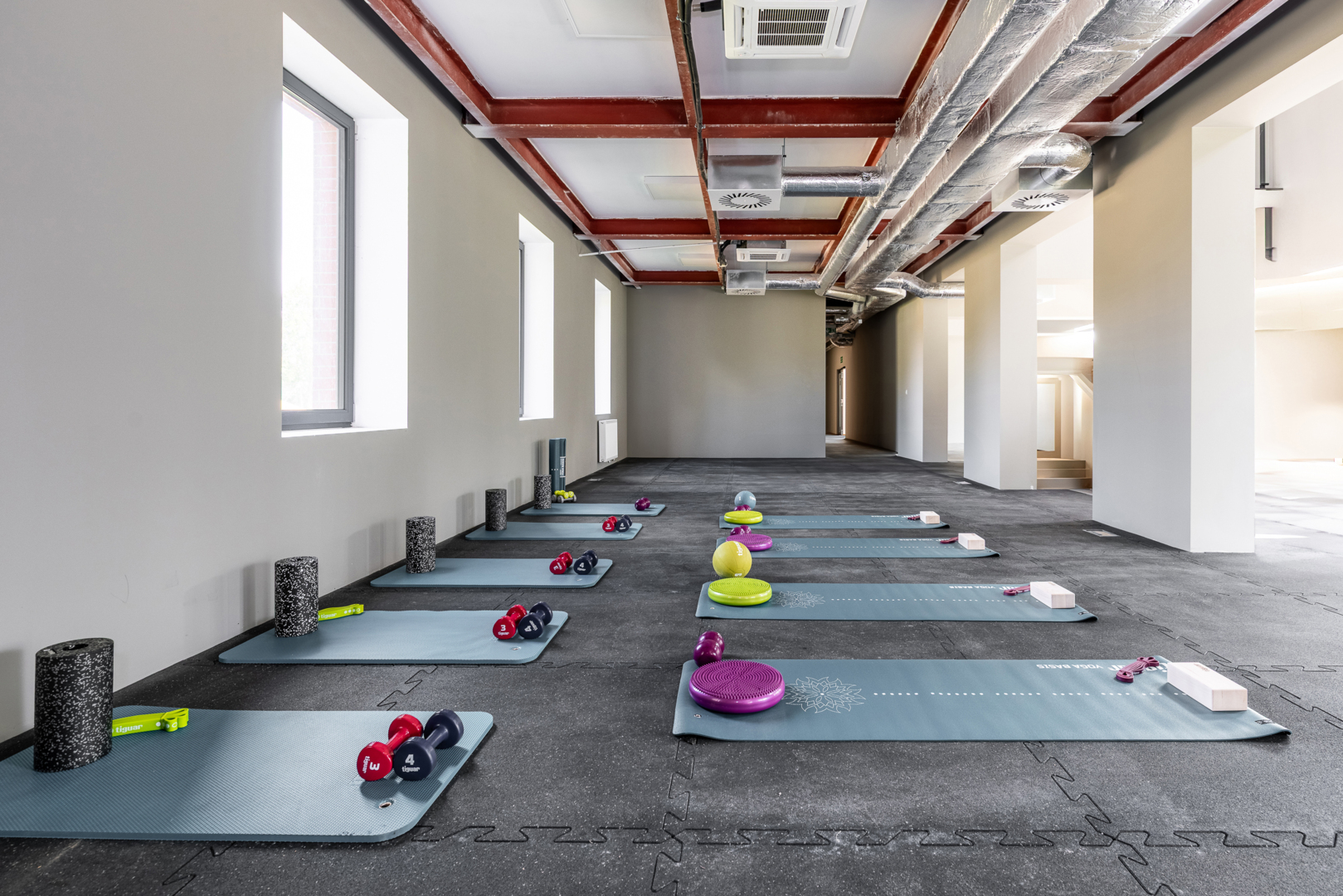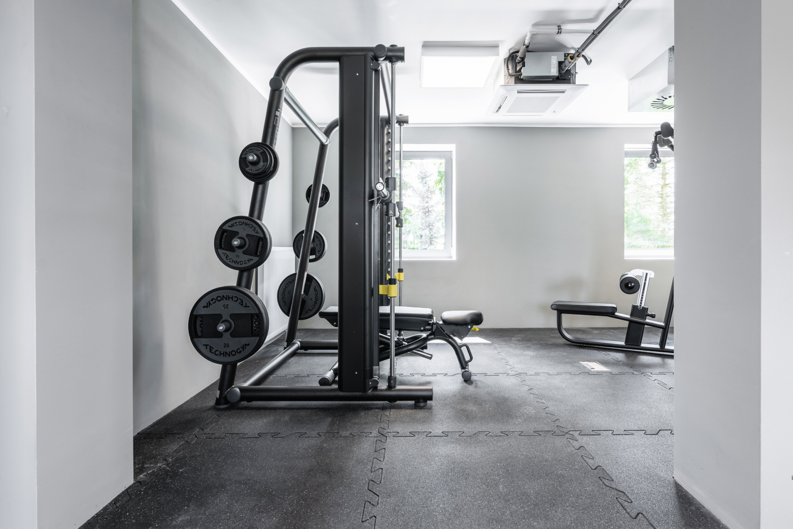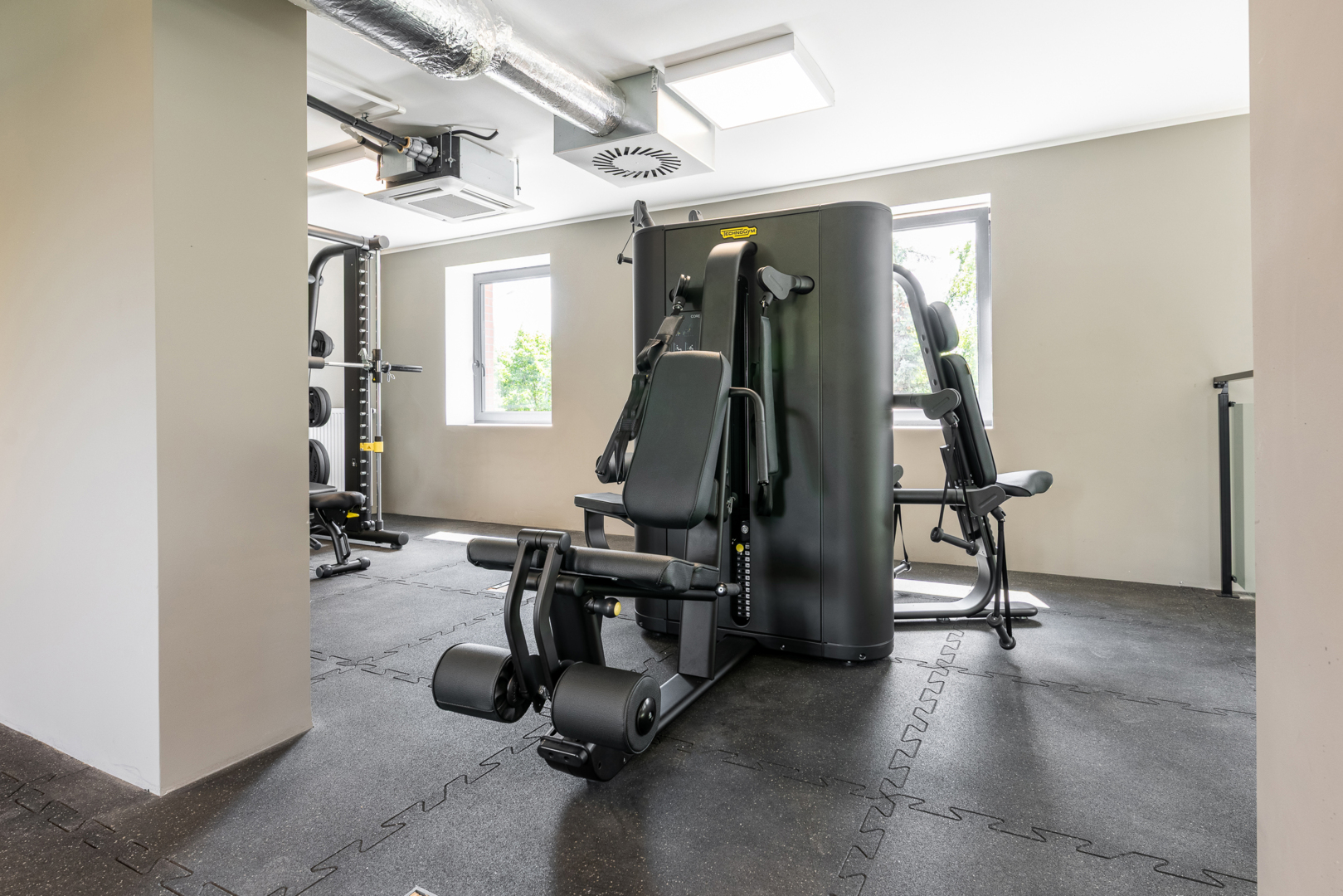 Nowoczesna siłownia hotelowa z różnorodnym sprzętem do ćwiczeń i naturalnym światłem przez okna.