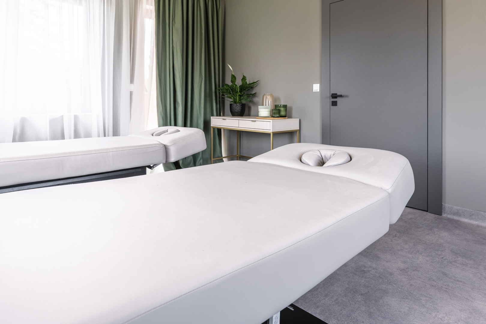 Nowoczesny pokój spa z dwoma białymi leżankami do masażu, zielone zasłony i stolik z rośliną i świecami