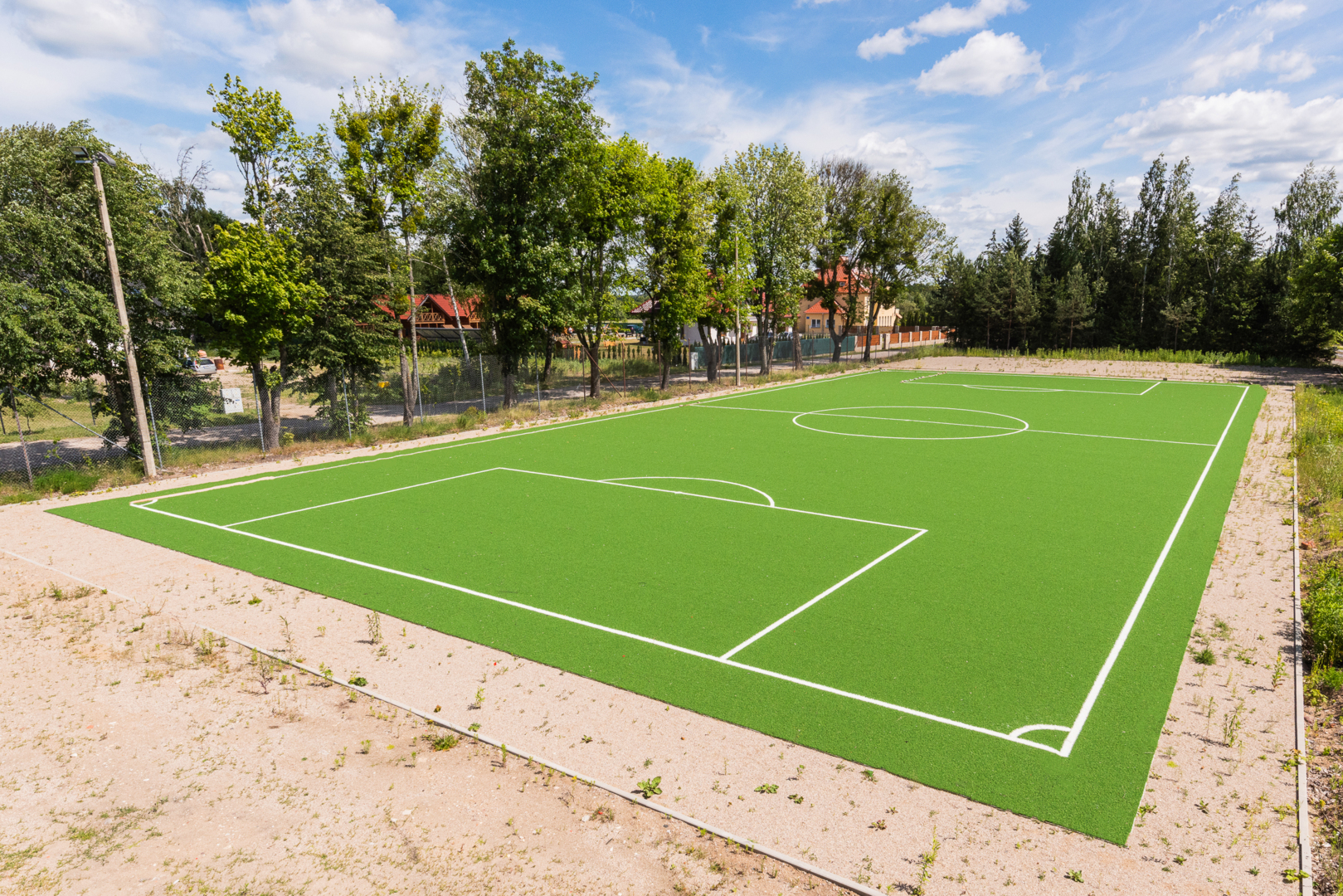Zewnętrzne boisko sportowe z zieloną sztuczną trawą, otoczone drzewami, idealne do rekreacji na świeżym powietrzu