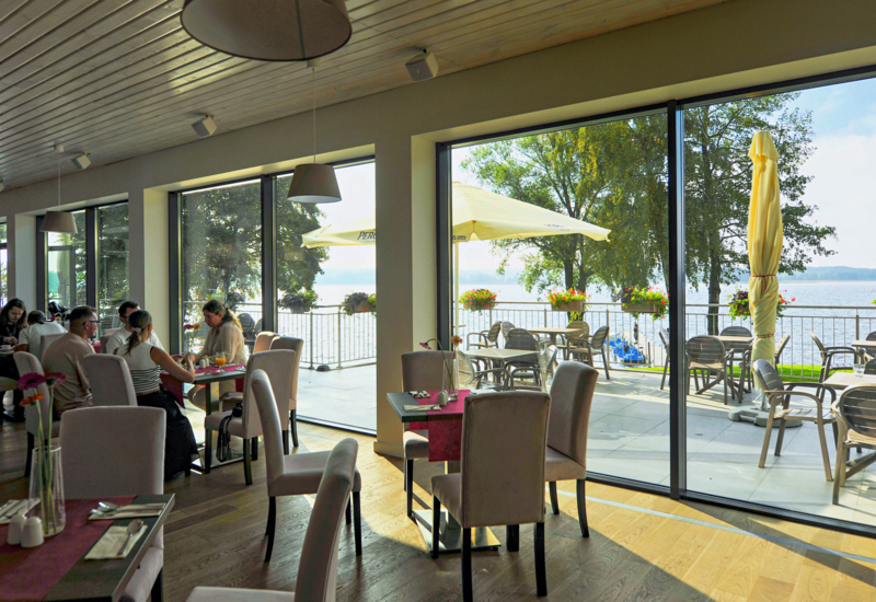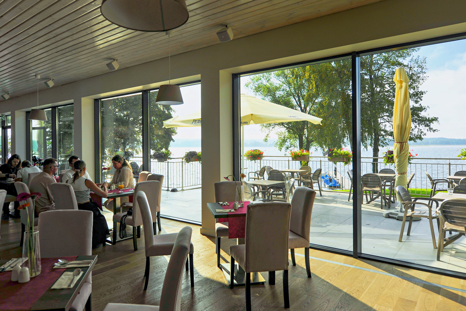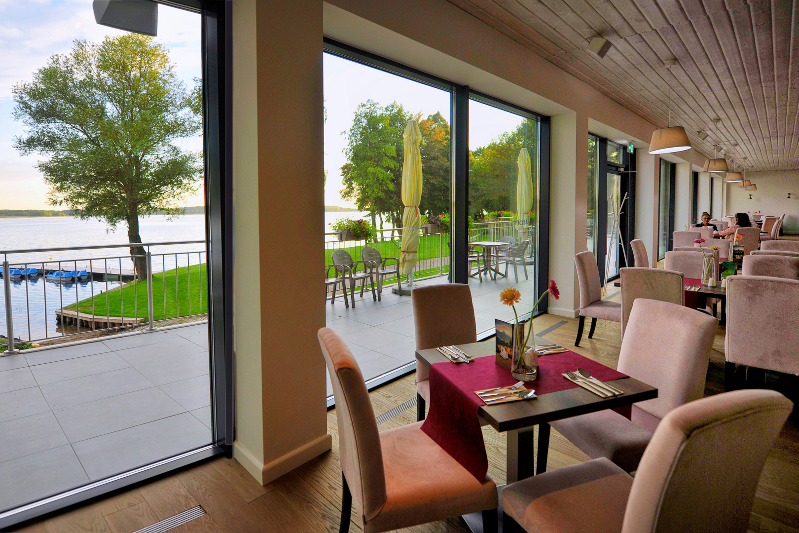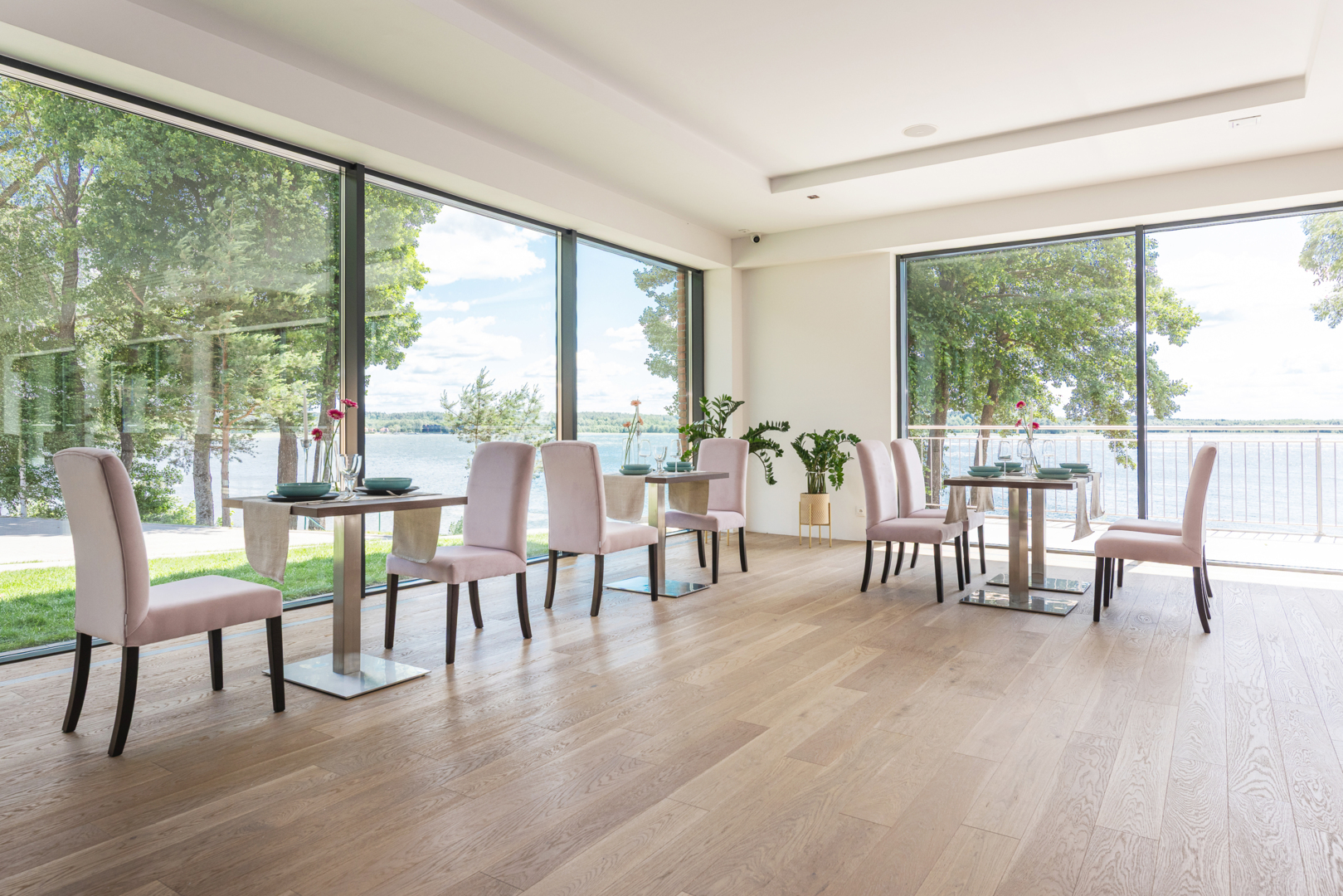 Jasna jadalnia z różowymi krzesłami i stołami, widok na jezioro przez duże przeszklenia i naturalne światło