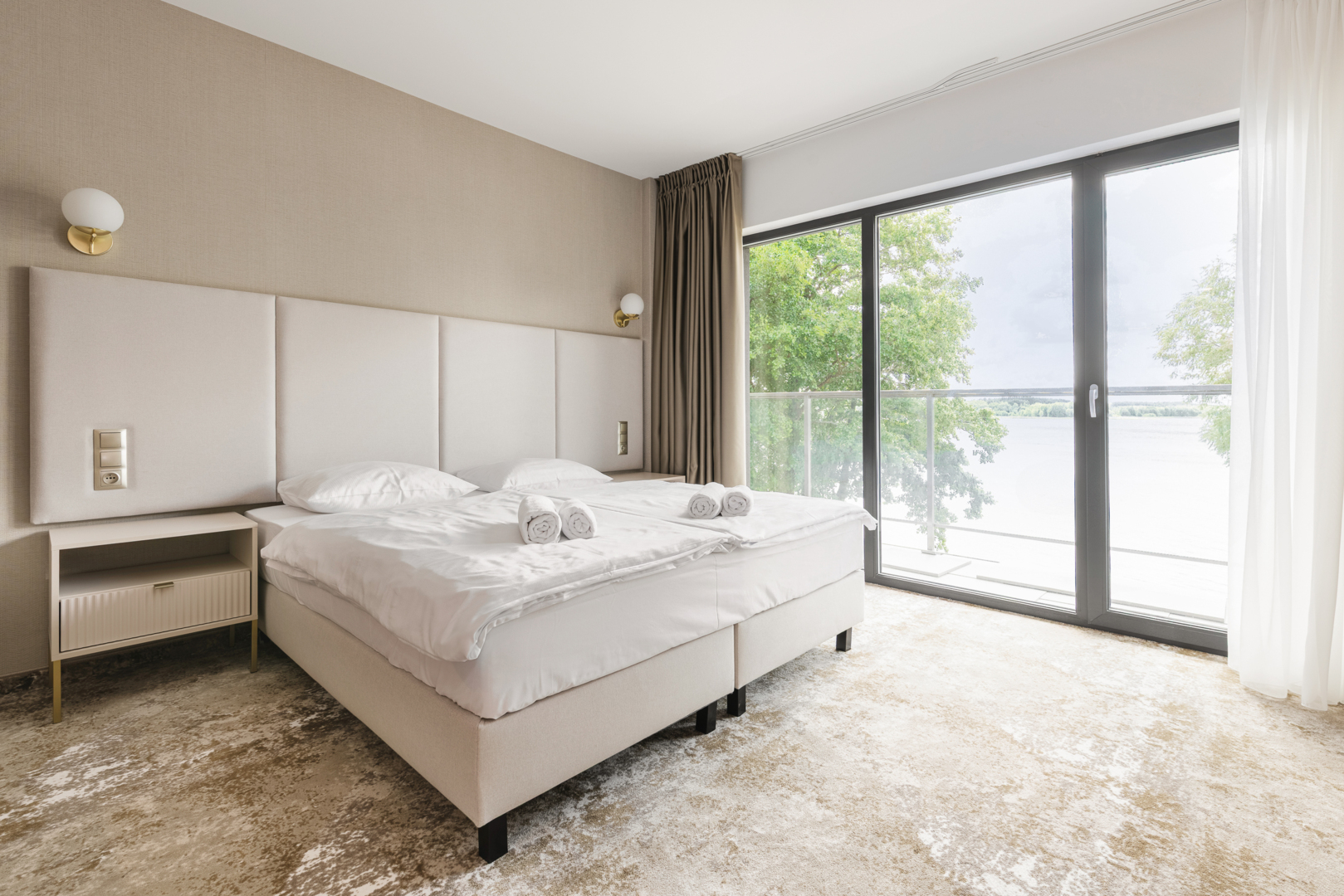 Jasny, nowoczesny pokój hotelowy z podwójnym łóżkiem, dużym oknem z widokiem na wodę i drzewami, dywanem i szafką nocną.