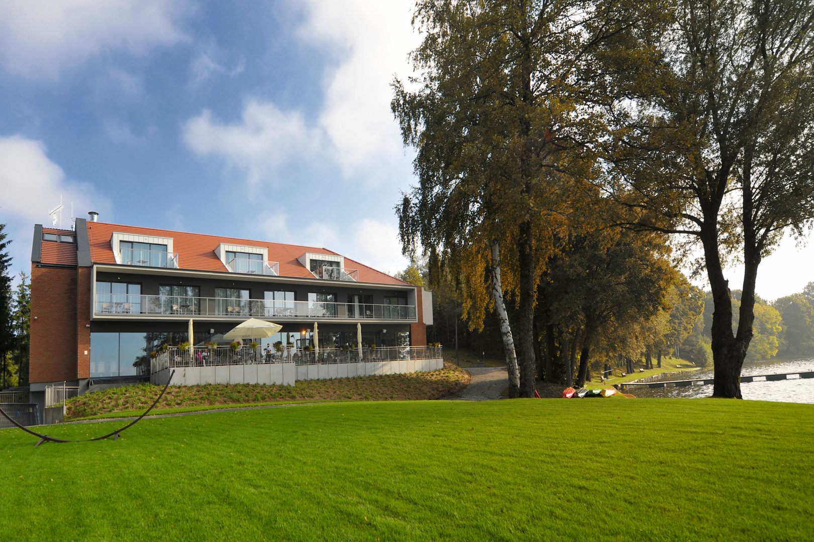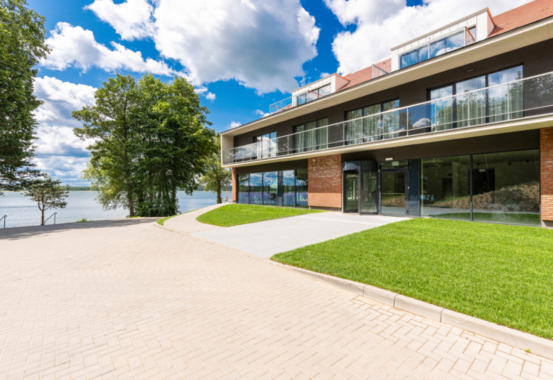 Nowoczesny hotel nad jeziorem z dużymi oknami, balkonami i zielonym terenem rekreacyjnym przy wodzie
