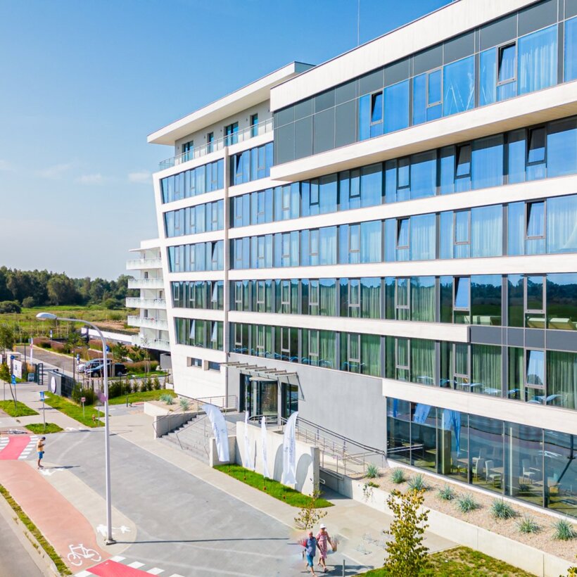 Blue & Green Hotel znajduje się na cichych obrzeżach Kołobrzegu, tuż przy granicy z Grzybowem. To znakomita lokalizacja dla tych, którzy szukają wytchnienia z dala od tłumów i miejskiego zgiełku. Od pięknej, szerokiej plaży dzieli nas zaledwie 500 metrów – możesz na nią dotrzeć spokojnym spacerem w zaledwie 5 minut, chłonąc zapach sosen i szum fal. W okolicy znajduje się także plaża, na którą możesz wejść z psem – idealna na wspólne spacery o poranku i zachody słońca, które zostają w pamięci na długo.