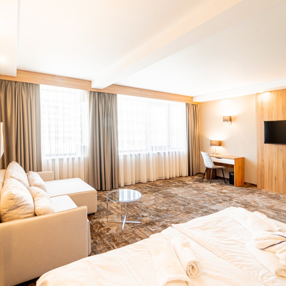 Jednym z największych atutów wesela w hotelu jest możliwość przenocowania gości na miejscu. W Blue & Green oferujemy komfortowe, klimatyzowane pokoje z częścią wypoczynkową, łazienką z prysznicem typu walk-in i dostępem do wszystkich hotelowych udogodnień. To wygodne rozwiązanie – zwłaszcza gdy wesele trwa do późnych godzin wieczornych, a goście przyjeżdżają z różnych stron. Rano można spotkać się jeszcze przy wspólnym śniadaniu i spokojnie zakończyć ten ważny dzień – bez pośpiechu i logistycznych utrudnień.